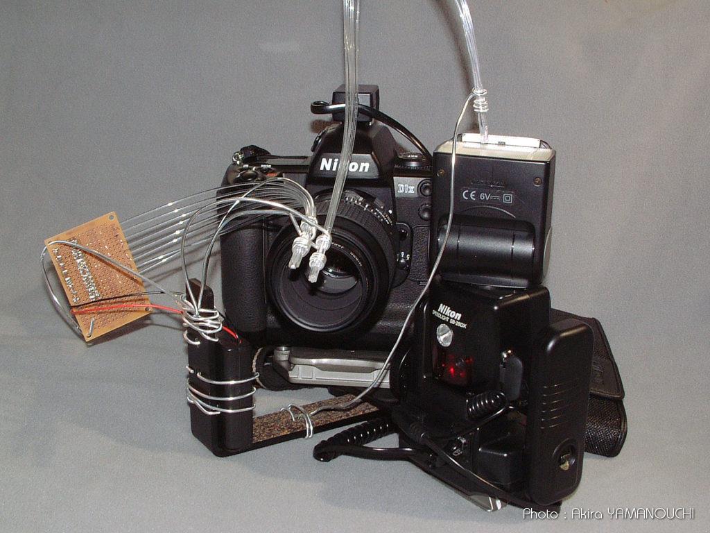 写真の右側の光ファイバーがストロボ光の導入用で、左側の基盤とファイバーはLEDによるピント合わせ用の照明装置です。暗室での撮影なので、これがないと何も見えないのです。