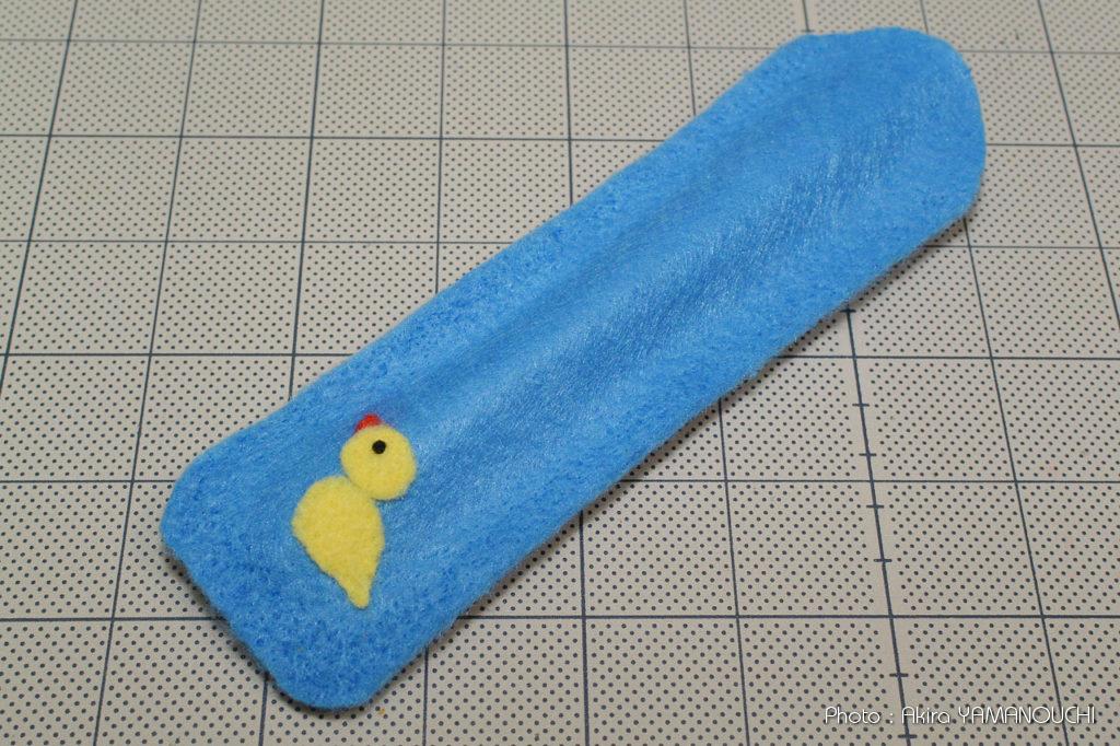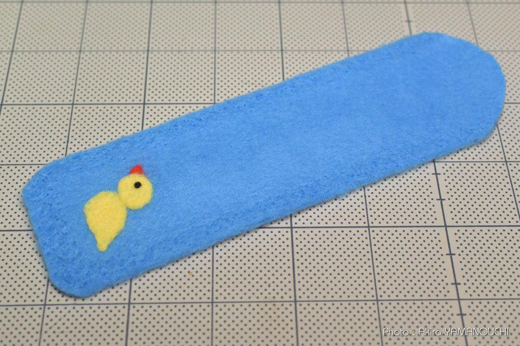 次はモナムールフェム用です。ひよこを付けてみました。適当に切ってニードリング用の針でザクザク刺すと瘉合します。袋を形成してからではできないので、1枚の時にアップリケを付けてからふちを瘉合させます。