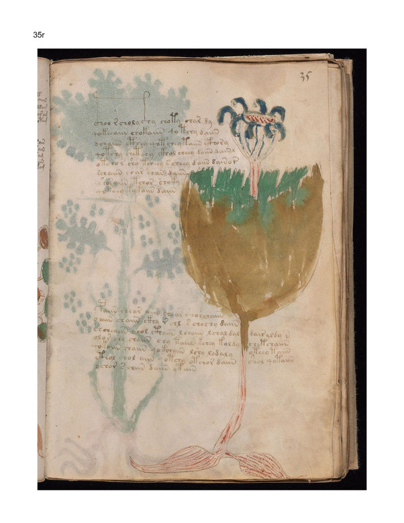 前半はこのような植物らしき絵と文章で構成されています。しかし、植物学者が精査したところ、地球上に現存する植物ではないようです。空想上の植物なのでしょうか。
