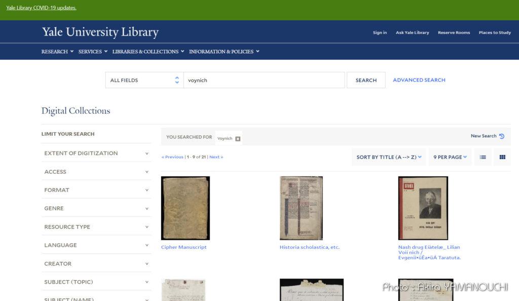 ヴォイニッチ手稿は古書収集家のヴォイニッチ氏が購入後に世に紹介したためにヴォイニッチ手稿と呼ばれていますが、歴史的には様々な人の手に渡って来たことも知られています。最終的に現在はイェール大学のバイネキ稀覯本・手稿図書館に所蔵されています。