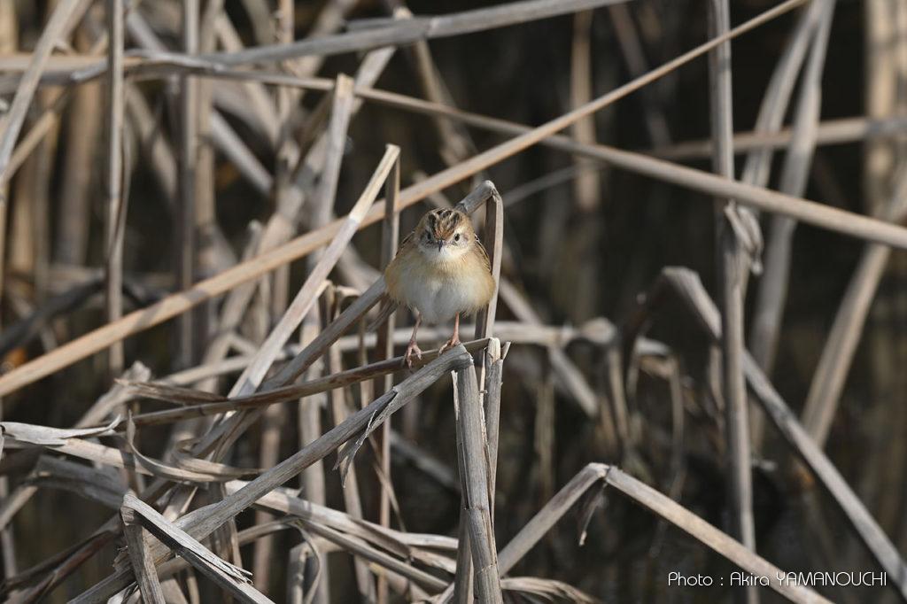 家内が撮ったセッカちゃん正面図です。スズメよりも小さい小鳥で、かつ常に動き回っているので撮影は比較的困難です。アシが茂るような水辺を住処としているので、なかなか全身をクリアに見せてくれません。動かずに辛抱強く待っていると稀にひょっこりと出てきてくれます。