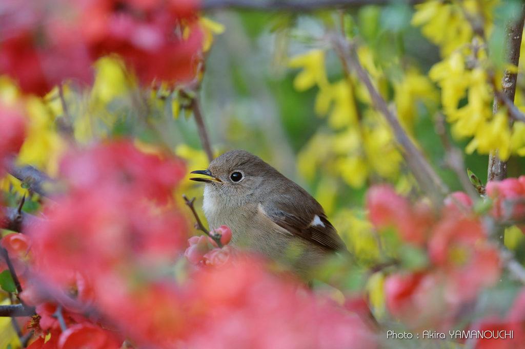体色が地味なので、背景も地味だとどこに何がいるのか分からなくなってしまいます。保護色としてはうまく行っているのでしょうが、それだとカレンダー写真としてはインパクトが薄いので、派手目な背景を選ぶと引き立ちます。新緑の緑なども良い背景になりますが、この日はちょうどボケ(植物の「ボケ(木瓜)」です。わざとピントをはずしたボケがボケ(木瓜)の花なのでややこしい)とレンギョウをバックにできる枝にとまってくれました。前景と背景をうまくぼかすと表紙の候補になると思い、絞りを開放に開けて積極的に赤い花の「前ボケ」を取り入れて、幻想的な雰囲気になるようにかなり狙って撮影しました。できるだけ感度が下がるよう、シャッター速度を1/200秒にまで落として撮影しました。白飛びしないよう、マイナス1段の補正をしています。35mm判換算1050mm相当で手持ち1/200秒でブレずに撮れるのは、腕ではなくカメラの手振れ補正機能の恩恵です。これでISOが320に抑えられ、B4に耐える画質を維持することができました。