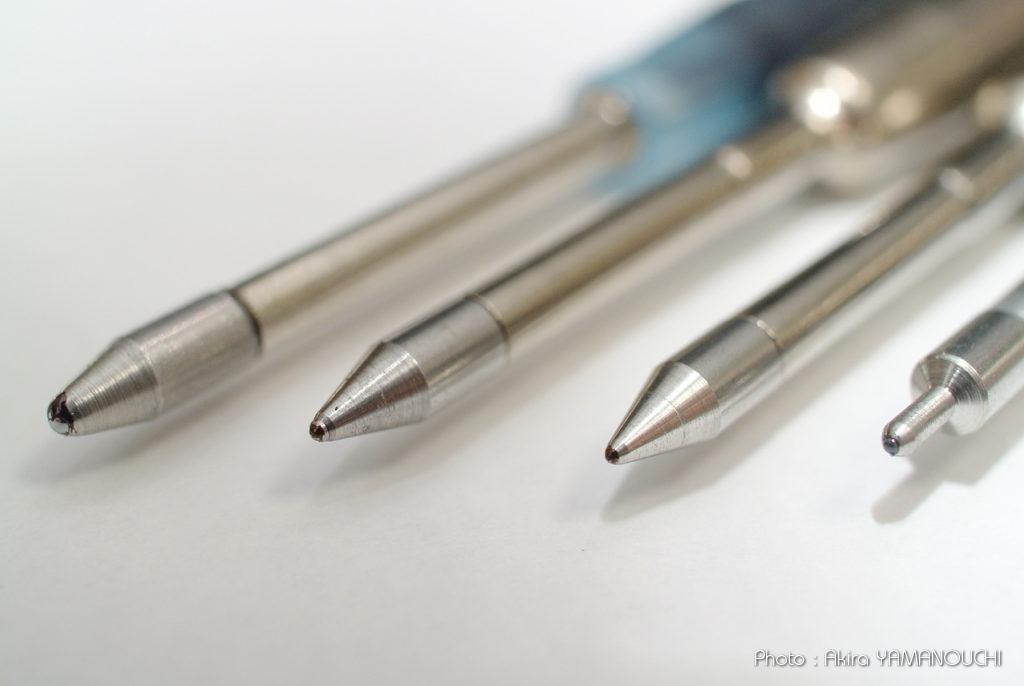見てください。こんなに違います。左から2番目がジェットストリームのボール径0.5mmです。一番左の付属してきたリフィルのボール径は軽くその4倍はありそうな大型のボールです。繊細な日本人には不向きです。