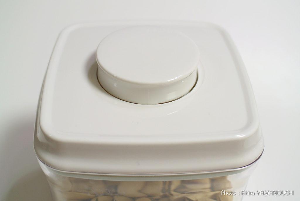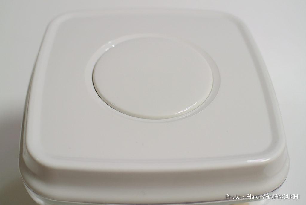 蓋の中央のボタンを押し込むと密閉され、もう一度押すと開放される簡単操作です。以前からこの手の機構はありましたが、あまり気密性が高くなく、ロック状態でも蓋が簡単に外れたりしました。この製品はかなり密閉性がありそうで、ロック状態で蓋は簡単には外れません。