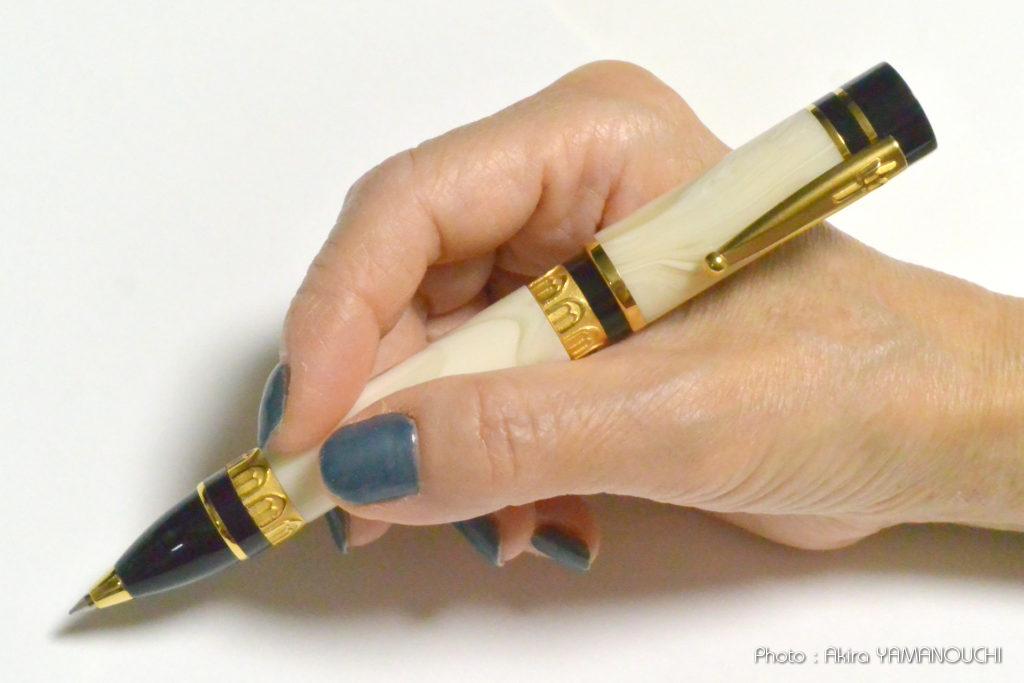 思った通り、大変美しいペンです。やはりこういったデザインはイタリアに勝るものはありません。形はオーソドックスですが、しっくりと手に馴染み、知的で落ち着きのあるエレガントな雰囲気を醸し出しています。可愛さと美しさを両立させた素晴らしいデザインだと思います。遊び心を持ったイタリアの国民性が成せる業なのでしょう。ドイツ人や日本人には作れないデザインだと思います。