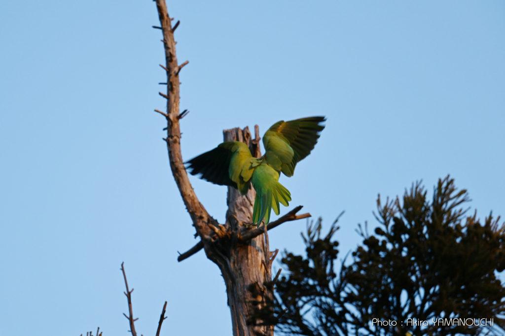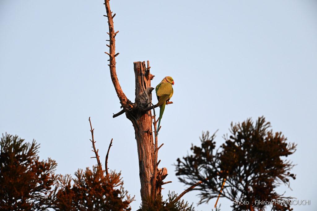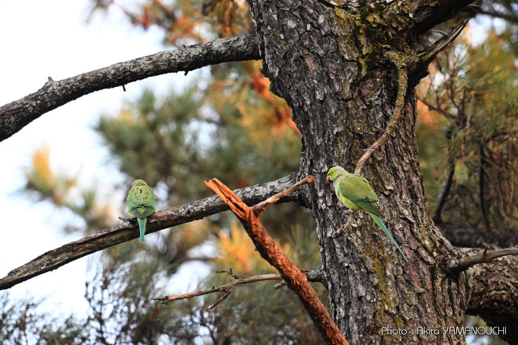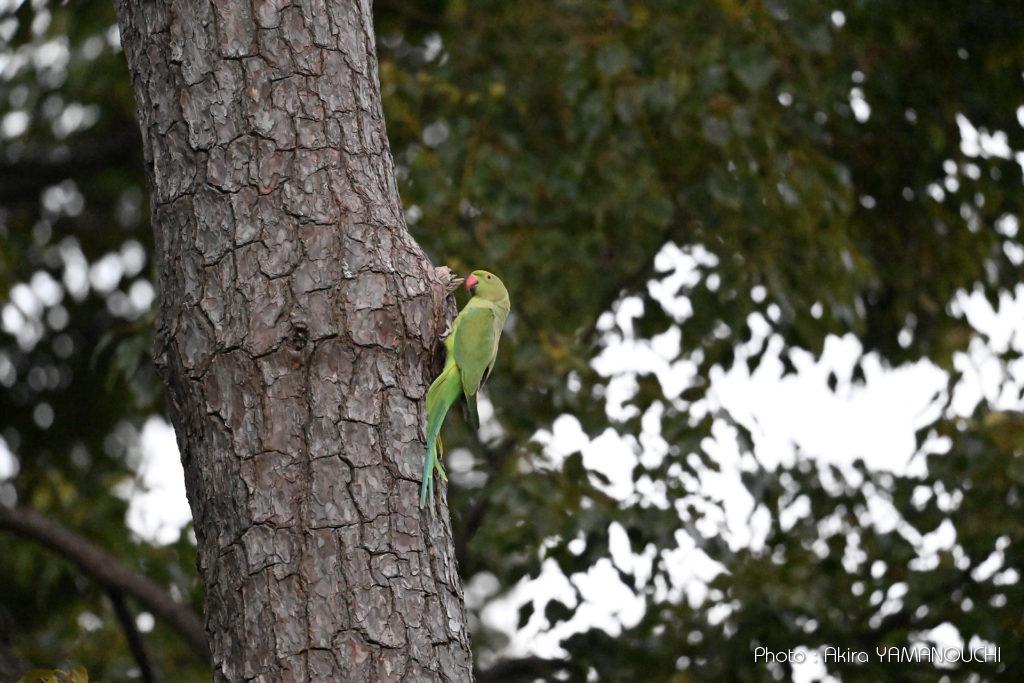 ワカケホンセイインコがいました。日本の鳥の生態系を壊している外来種です。