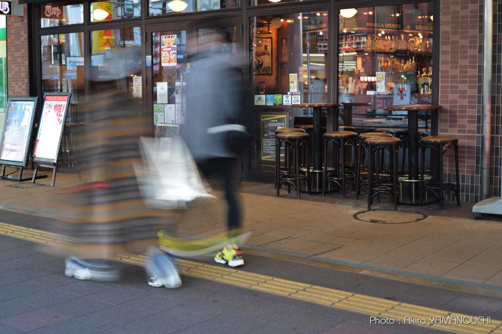 カメラを普通に構えると往来を止めてしまったりして迷惑をかけてしまうので、ウェストレベルに構えて、液晶を起こしてそれを見ながらシャッターを切りました。がっちりホールドしないとブレますが、1/2sでも期待通りに動くものだけブレ、背景はブレてない写真が撮れました。1/2sだとちょっと流れ過ぎなので、1/4sや1/8sでも良かったかもしれません。
