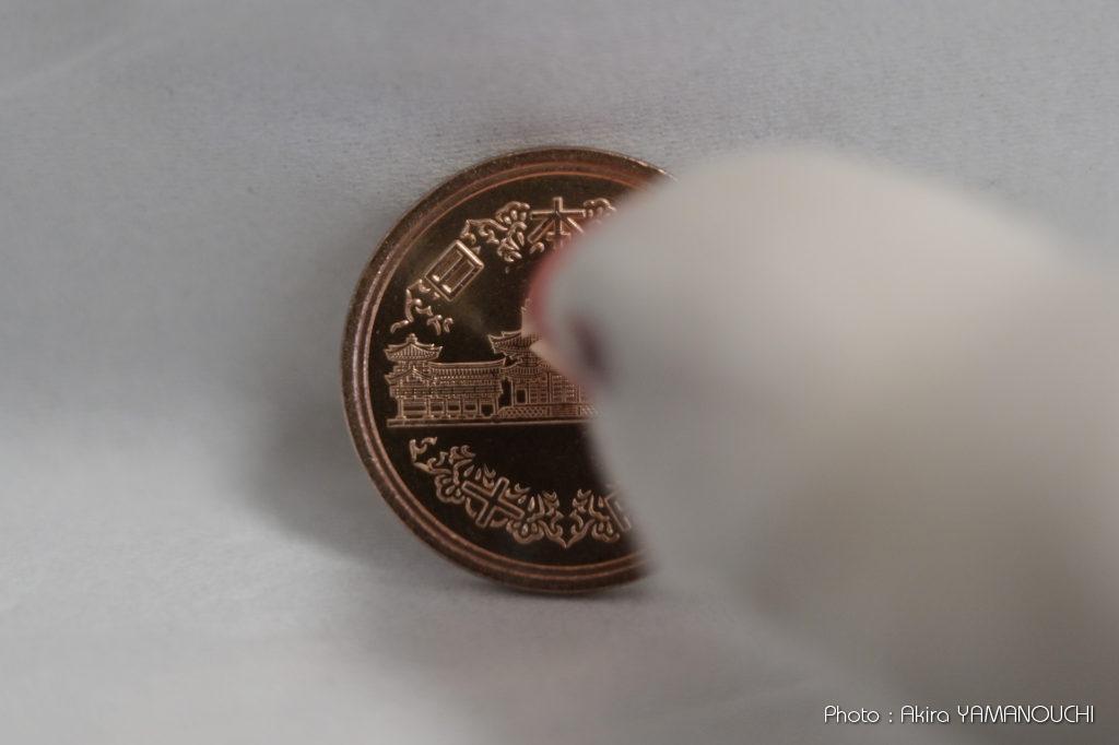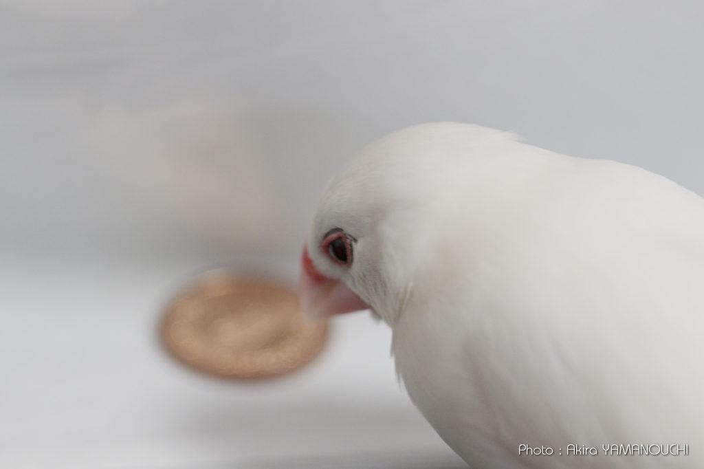 ブンチョウは好奇心旺盛です。見慣れないものはまずつついてみます。10円玉の撮影を始めると案の定興味を示し、せっかく良い角度でセッティングしても何度も何度もひっくり返しにきます。飽きるまでやり直しさせられました。そのため、撮影するたびに角度が変わってなかなか均一な写真になりませんでした。悪しからず。