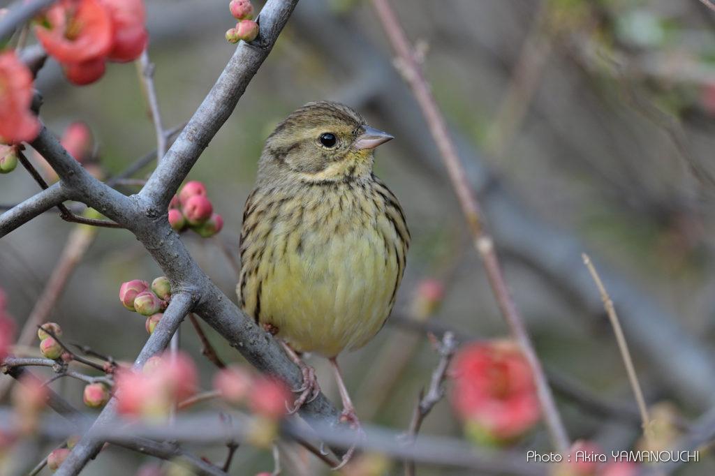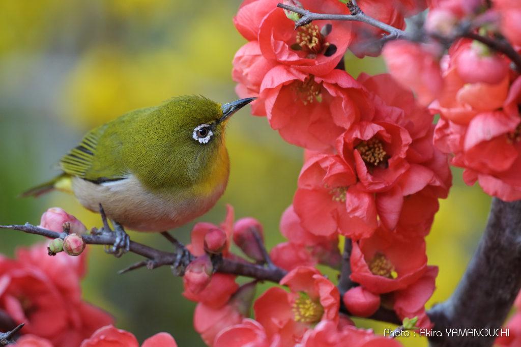 メジロです。ボケ(植物のボケです)とレンギョウとユキヤナギが同時に咲き誇る美しいブッシュに蜜を吸いに来ました。後ろの黄色いレンギョウが大きくボケてくれて良い背景になってくれました。