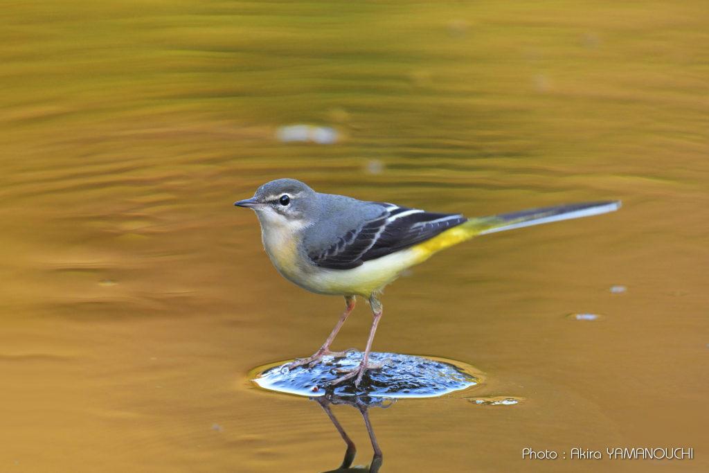 貴婦人のようで大好きなキセキレイです。大変スマートで均整のとれたフォルムだと思います。たまたま背景の黄色く紅葉がはじまった木々が水面に写り込み、独特な雰囲気になりました。