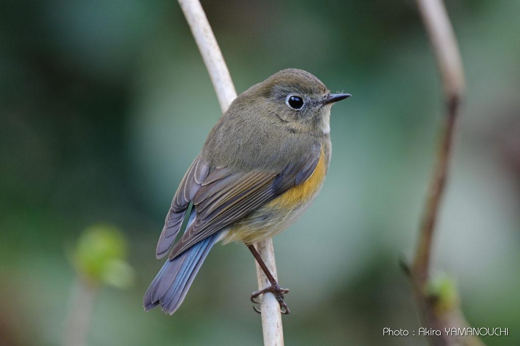 頭から背にかけては地味なオリーブ色で、脇のオレンジと尾の青色にルリビタキである片鱗が見られます。