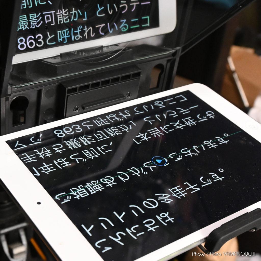プロンプターとは、カメラレンズの前に45度に傾けたガラスを置き、原稿をカメラレンズと同じ位置に表示する装置です。テレビ局などで使われているものは大型のものですが、最近はスマホやタブレットで表示した原稿をレンズと同軸で表示する簡易なプロンプターが販売されています。