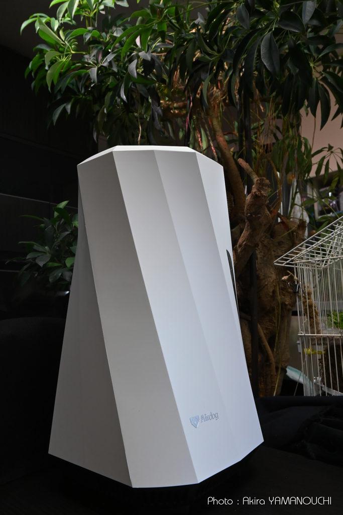 まずはこのデザインに惚れました。加湿器というと、なぜかやたら丸々したデザインの製品が多いのですが、エアドッグモイは捩じれた多角柱の形状で、各面は光の加減で美しいグラデーションが現れる設計です。冬の間は毎日24時間使うものですから、デザインは大事な要素です。デザイナーに敬意を表します。