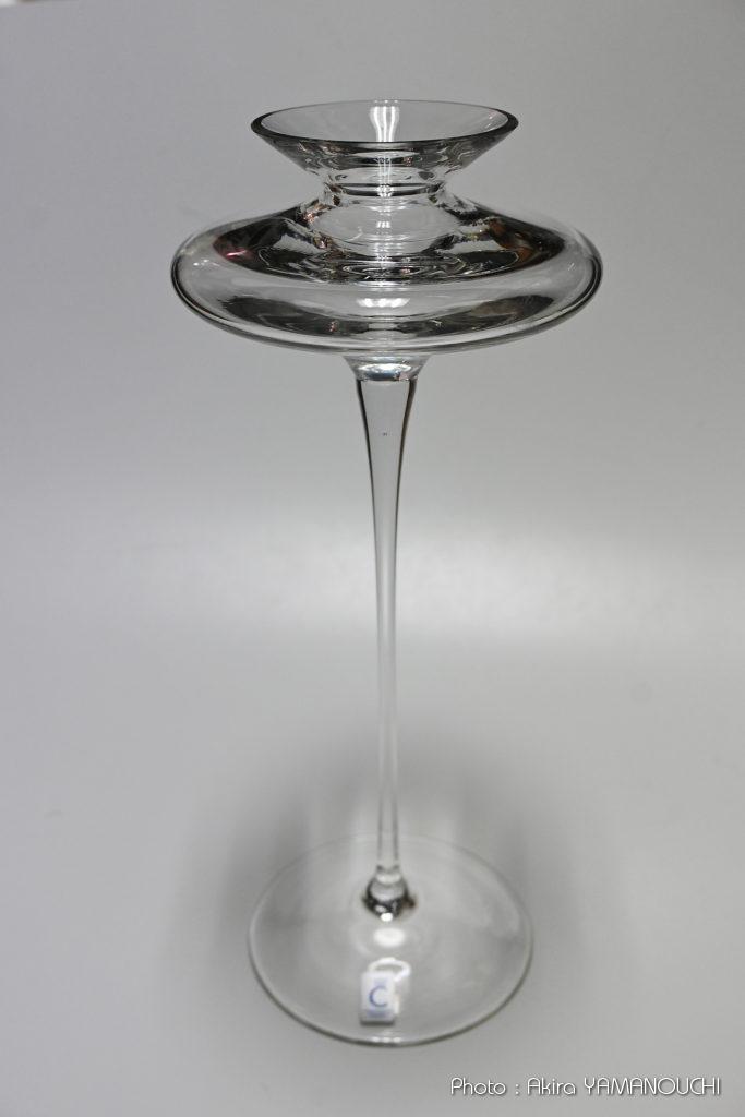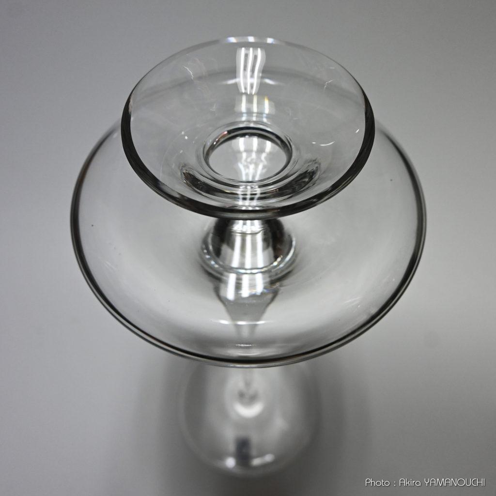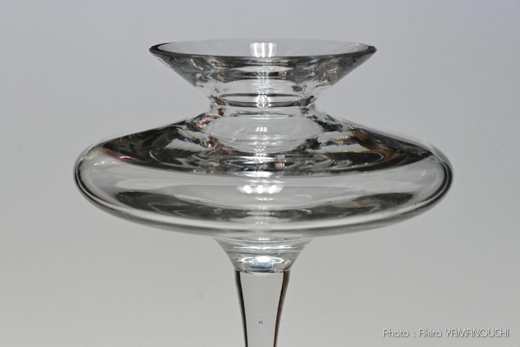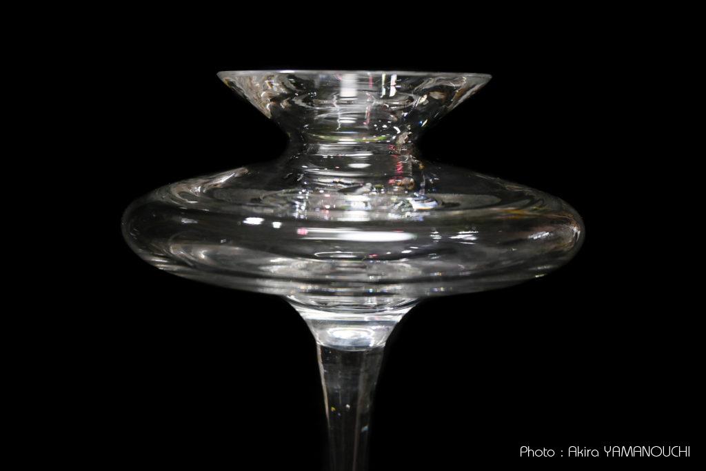 ネットが普及してから調べるとドイツの有名なガラス工芸品メーカーだったのですね。大変マニアックなガラス工芸品を製作するメーカーのようですが、類似の形状のものは検索しても出てきません。素敵なコップや花瓶はたくさん出て来るのですが、このように高足で上部にくびれたUFOのようなものが乗った形状の製品は見つけられませんでした。超レアな一点ものでしょうか。