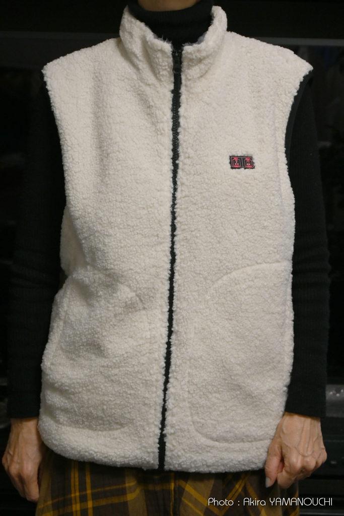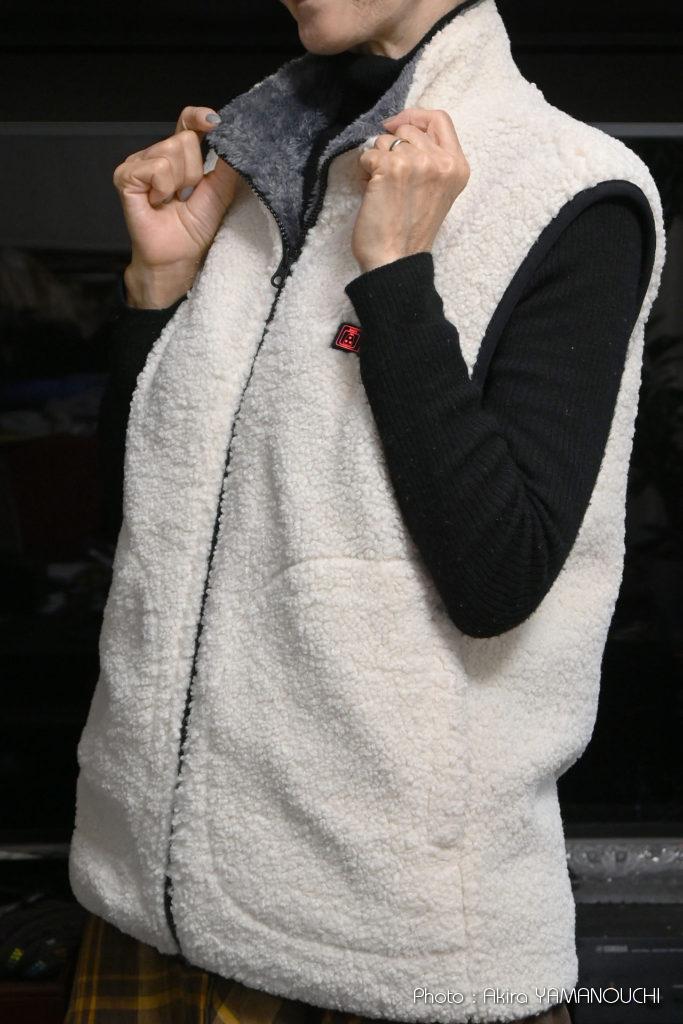 ファッション用語は良く分かりませんが、「ボアフリース」と言うのでしょうか。表は羊のようなモコモコ、裏は毛足の長い起毛素材で、電源を入れなくてもそれだけでかなりの防寒になります。
