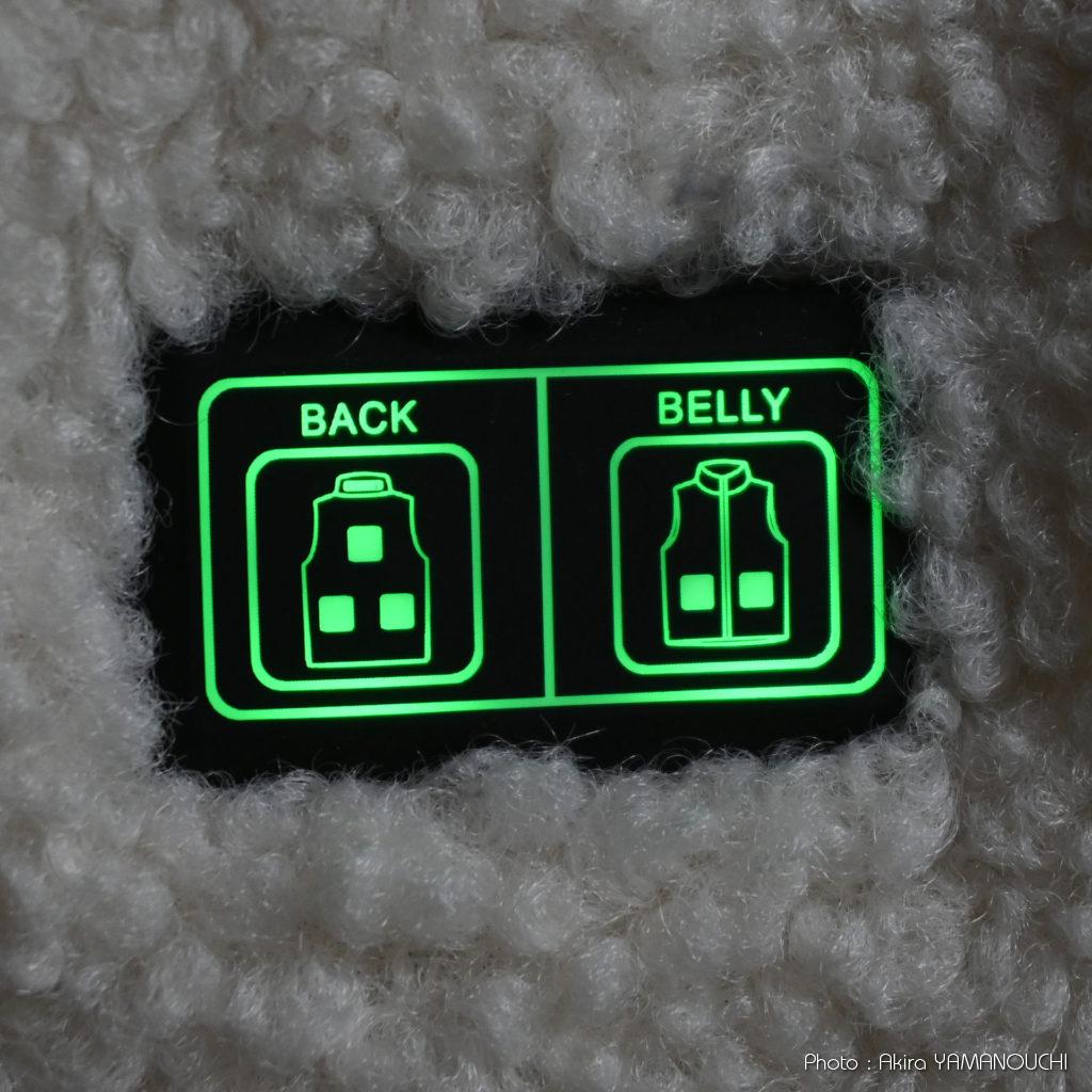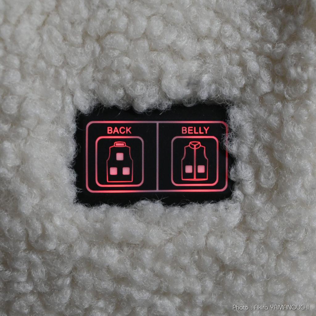 左胸表側に電源ボタンが2つあり、腹部、背面+首を別にコントロールできるようになっています。長押しでオンオフができ、普通に押すと強、中、弱の切り替えになります。強は赤、中は青、弱は緑に発光します。上になにか羽織らないとこの電源のライトが目立ちすぎるのでちょっと恥ずかしい気がします。