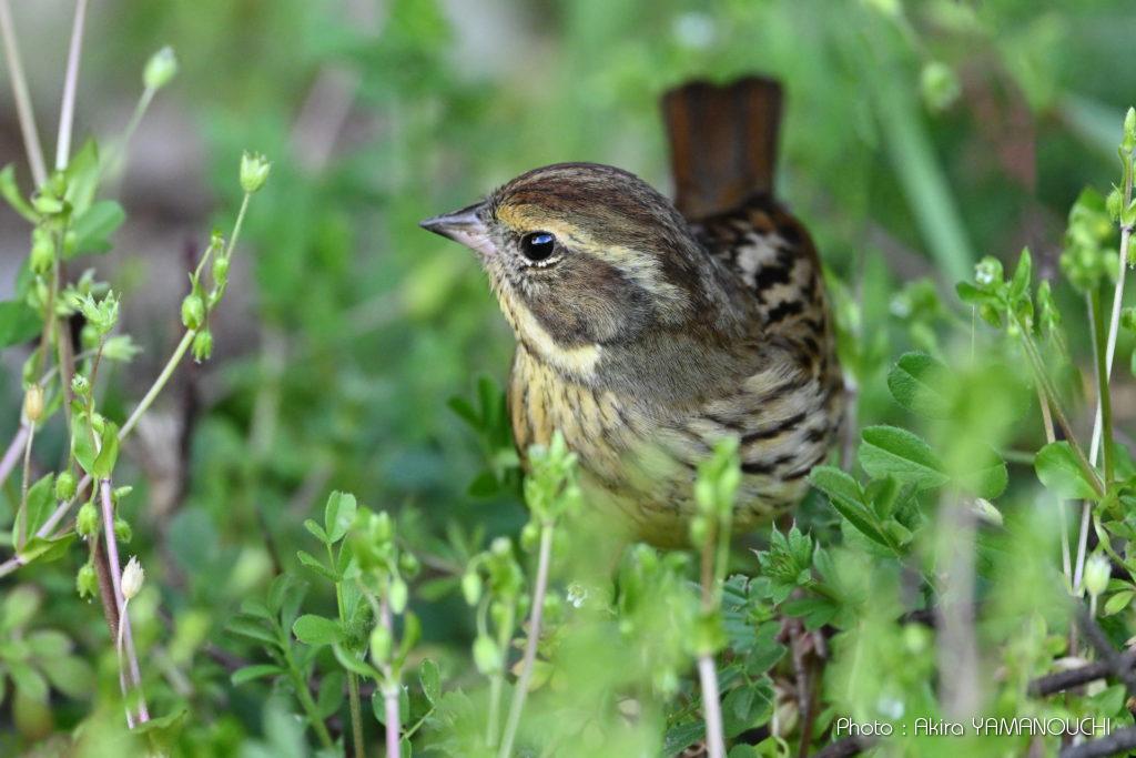 確かにスズメサイズですが、無垢であどけない顔がすこぶる可愛く、見ていると平和な気持ちになります。藪の中に群れでいることが多いのですが、人がいなくなると広場に出てきて採食をはじめます。時折「チッ」と短く鳴いてお互いの存在や位置を確認しているようです。この地鳴きを頼りに探すと出会えます。