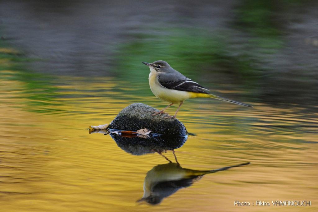 背景がきれいだったので、とっさに地面にはいつくばって秋色の反射が強くなる位置を探りました。それに応えてくれるように、ちょうど良いポーズをしてくれました。水面の反射は角度が浅くなるほど強くなり、遠方の色を映し出します。初秋らしい配色になってくれました。背景の黄色とかぶらないよう、緑色になるように最適な位置を探して写しました。手持ち撮影だから撮れたカットです。