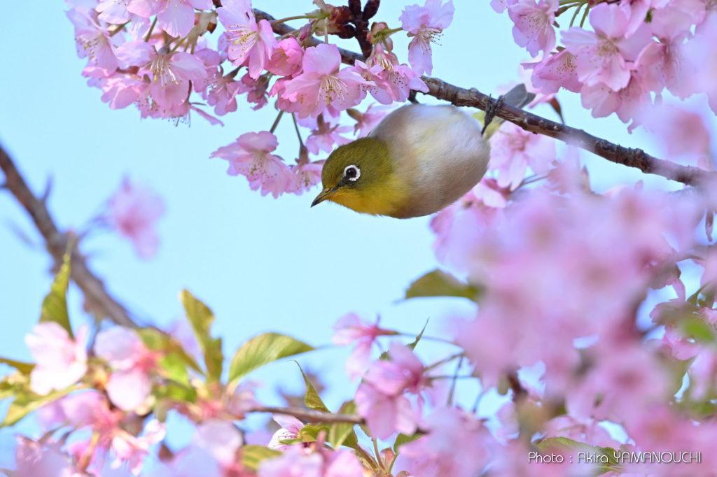 この写真は河津桜に集まっていたメジロです。冬の間は花が少ないため、蜜がすえないのでしょう。比較的早く開花する河津桜を待ってましたとばかりに集団で蜜をすいにきます。一心不乱に花の中にくちばしを突っ込み、蜜をすう姿が見られます。口の周りは河津桜の黄色い花粉がいっぱい付いています。花が咲く向きに合わせて、体をよじったり、逆さまにぶら下がったりしながら蜜をすっています。その姿が可愛らしいため、この季節はメジロ人気が急上昇します。