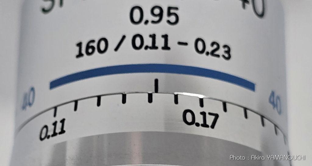 前述のNikonのサイトから分かるように、カバーガラス厚が0.17mmから0.01mm(1/100mm)ずれるだけでアポクロマートのようなNAが0.95もあるレンズでは性能が半分にまで落ちてしまうということです。そのために、0.17などと、1/100mm単位までの細かい数字でレンズに刻印しているのです。