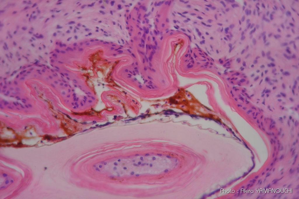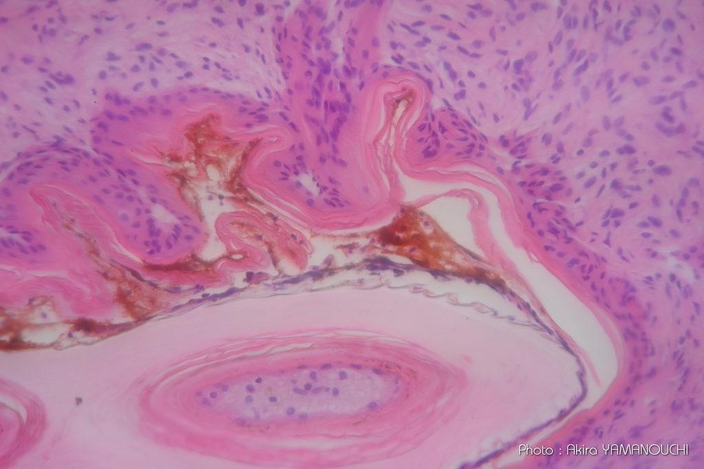 次に顕微鏡にセットして、最初に4倍や10倍の対物レンズで大まかな診断をしてしまいます。低倍率で全体を見て、「この辺にこんなに炎症細胞が集まっていると言うことは、ここが原発巣だな」などと言いながら全体を把握します。おそらく、彼らの頭の中では、この段階でほぼ診断は終わっているのでしょう。後はその診断の確認作業を行って確定していくという感じです。