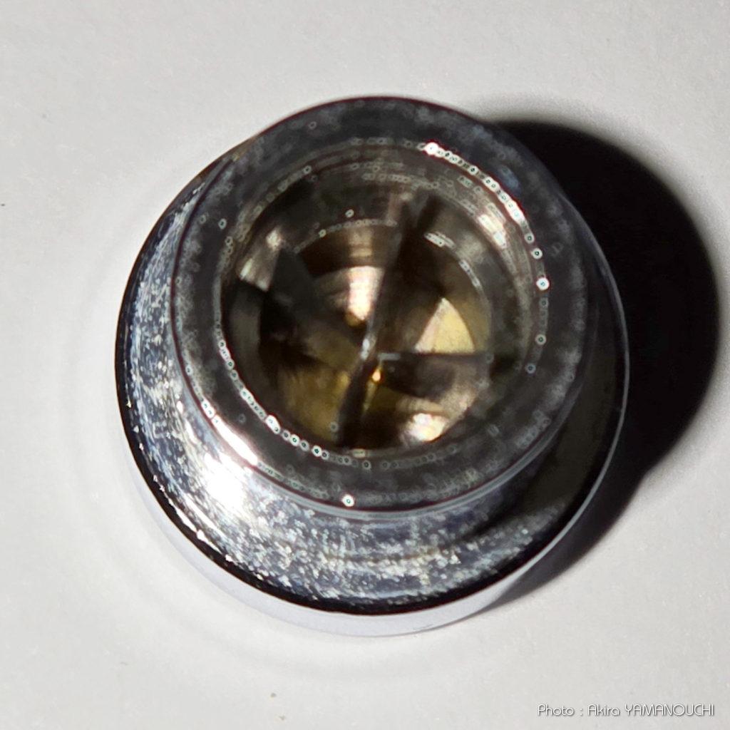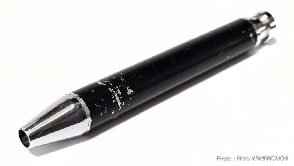 商品の説明にはアルミ、真鍮と書かれているので、円筒形の軸部分はアルミ、おそらく、先端やリアキャップは真鍮のクロームメッキ、内部機構はすべて真鍮でできていると思われます。