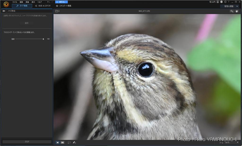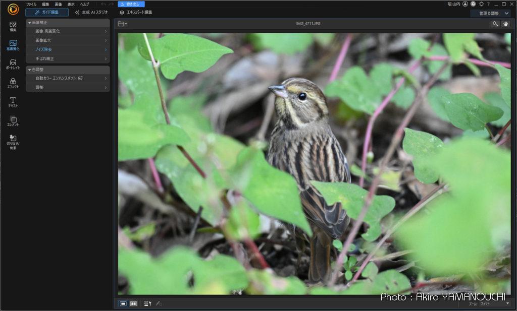 PhotoDirector 365を開いて、画像をドラグアンドドロップするだけで簡単に開け、「ノイズ除去」で高感度ノイズ除去処理を実行できます。実行後、スライダーで強度を調整できます。100%だとちょっとやり過ぎ感が出てしまうので、画像を見ながら少し下げています。概ね50-70%付近で使っています。元の絵のノイズの状態によって大きく変わるので、実際に画像を見て調整することをおすすめします。