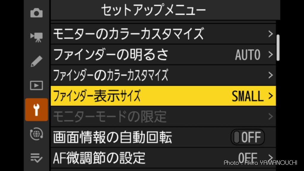 セットアップメニューの「ファインダー表示サイズ」から簡単に切り替えができます。
