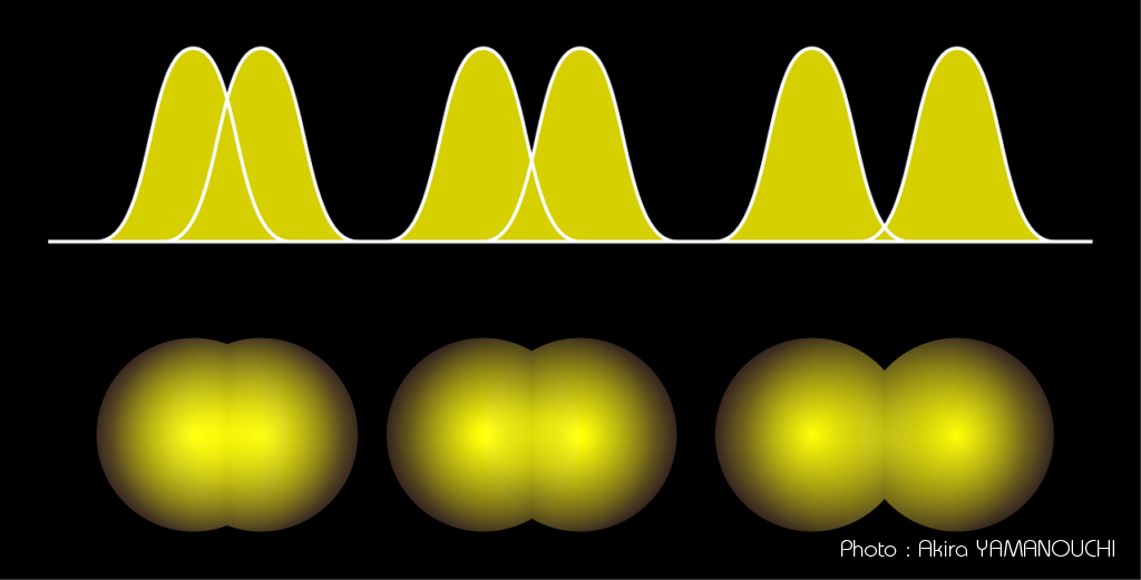 光学における分解能は、簡単に言うと2点を2点として分解できる最小の角度です。たとえば、夜空の星で、非常に近接して見える2つの星が2つの星として見えるか否かという基準です。その2つの星と目が作る角度です。星は本来面積のない点光源なのですが、どんなレンズを使っても口径が有限であれば回折現象によって必ずある面積を持った光源像として写ります。それをエアリーディスクと呼びますが、口径が大きいとエアリーディスクは小さくなり、口径が小さいとエアリーディスクは大きくなります。大口径のレンズでは2つの星に見えていても、小口径のレンズではエアリーディスクが大きくなり、光源像はダルマのようになったり、完全に繋がって一つの像になってしまいます。