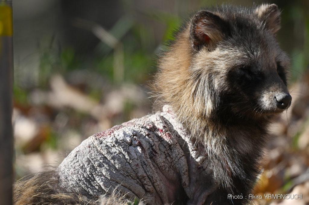 タヌキと思われる動物。頭部と下半身の一部を除いて、全身がおそらく疥癬に侵されていました。今は良い薬があるから何とかしてあげたいけど、捕獲して治療するのは大変そうです。