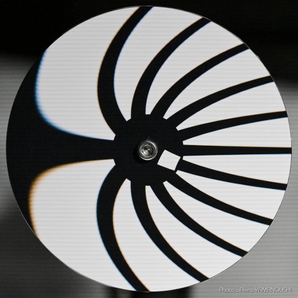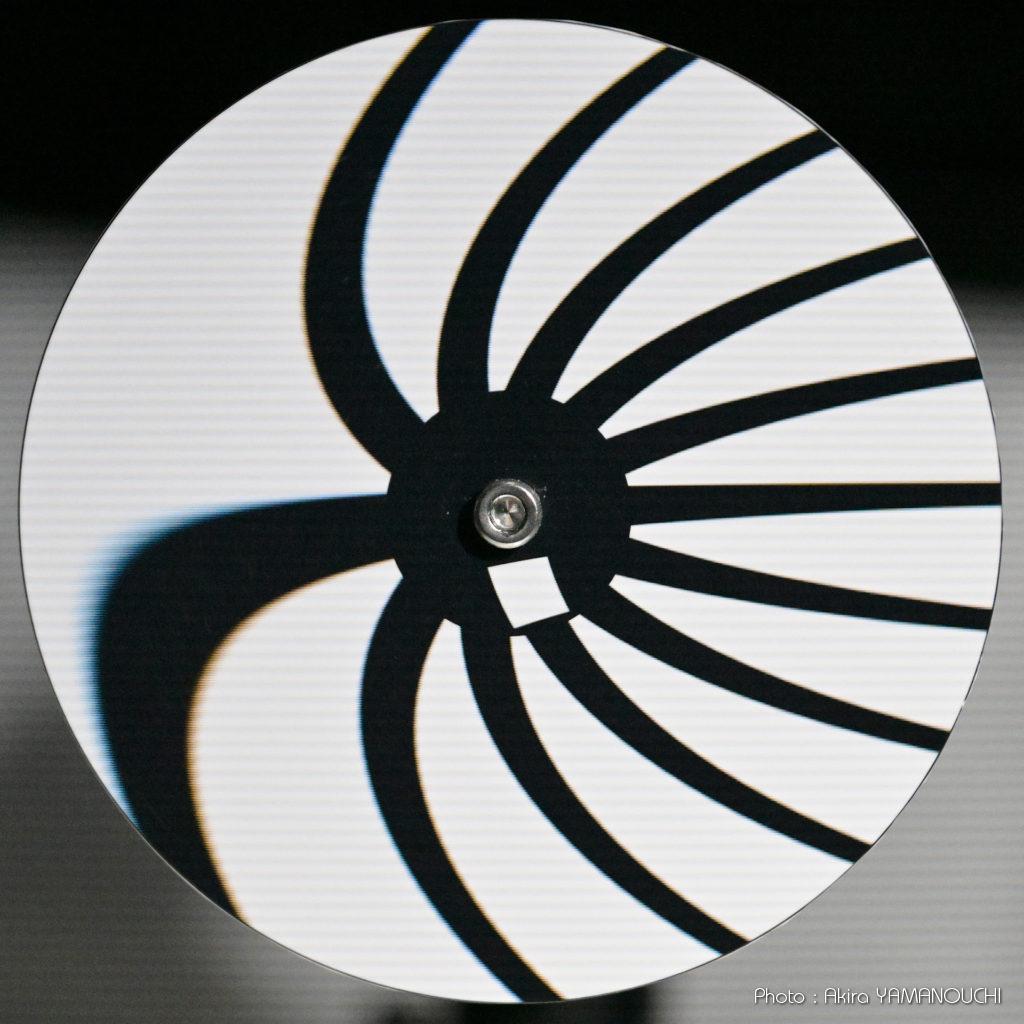 とりあえず、ここではフルサイズメカニカルシャッターとの比較ではなく、事実を述べるにとどめておきましょう。冒頭の放射パターンを5600 rpmで回転させたものをZ9FXフォーマットの画面いっぱいに写すとこのように歪むということです。