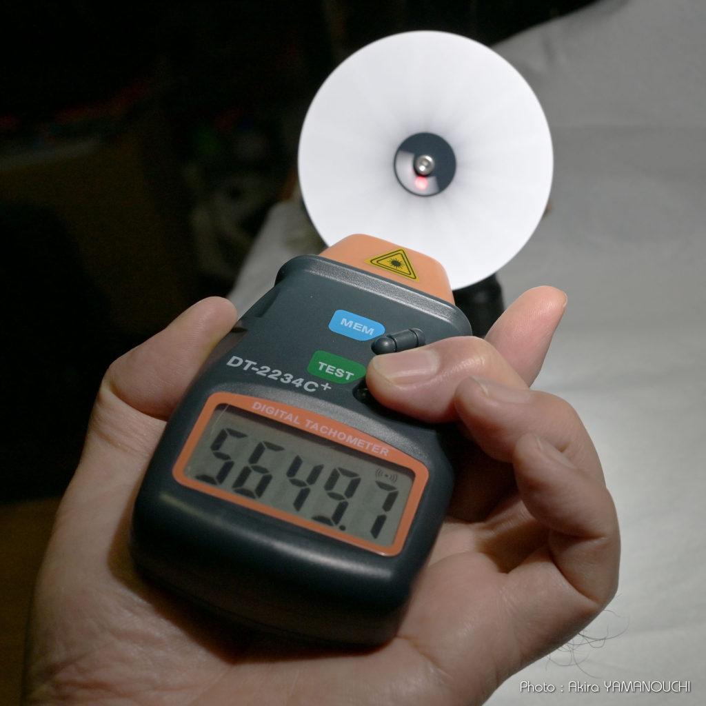 非接触型回転数計測機( FCMADE 社製 FMTDT2234C )を使用し、ターゲット中央近くの白抜き部を狙って回転数を計測しました。リューターの軸にも反射テープを貼り、その数値と比較してほぼ同じであることも検証しています。