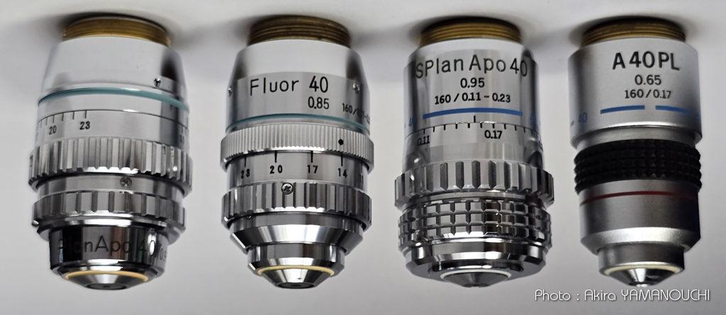 顕微鏡写真も生業としているため、撮影用の対物レンズを各種揃えています。顕微鏡写真は対物レンズが命なので、こだわりを持って選んでいます。中古で購入したり譲り受けたりした様々なグレードの対物レンズもありますので、具体的な比較画像を撮ってみたいと思います。良く使う倍率で、グレードの差が出やすいのが40倍なので、様々なメーカーの様々な仕様の40倍レンズを比較してみます。顕微鏡購入時の参考になれば幸いです。