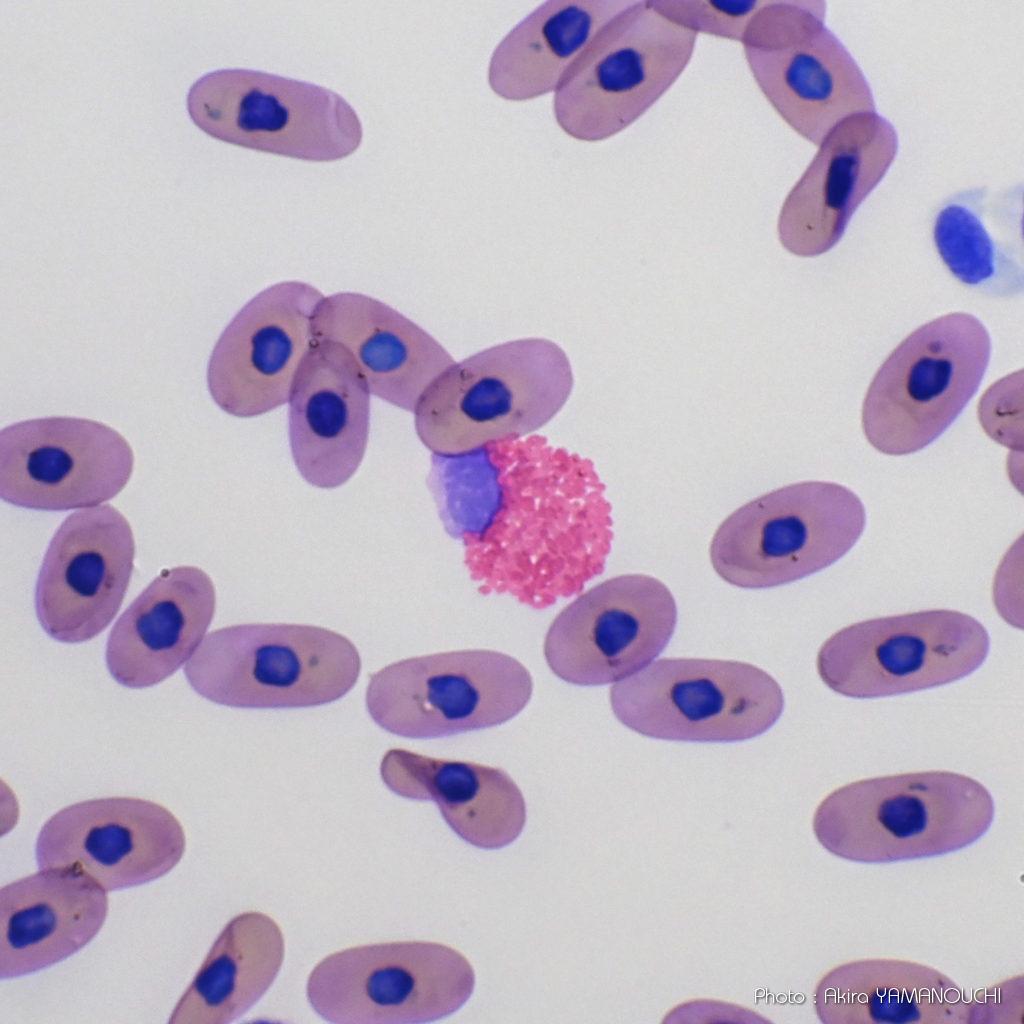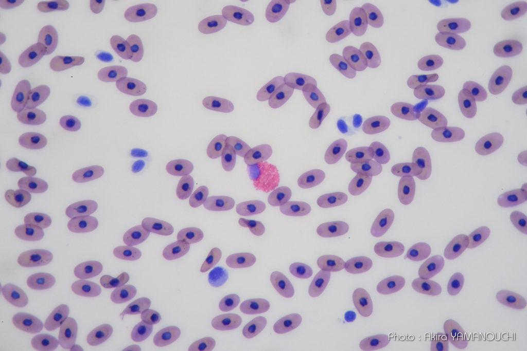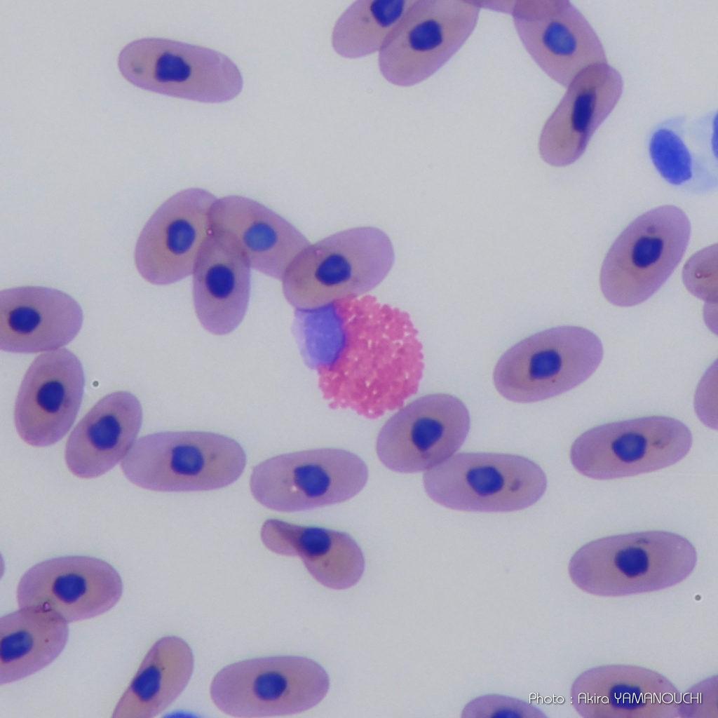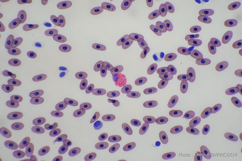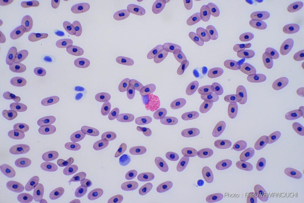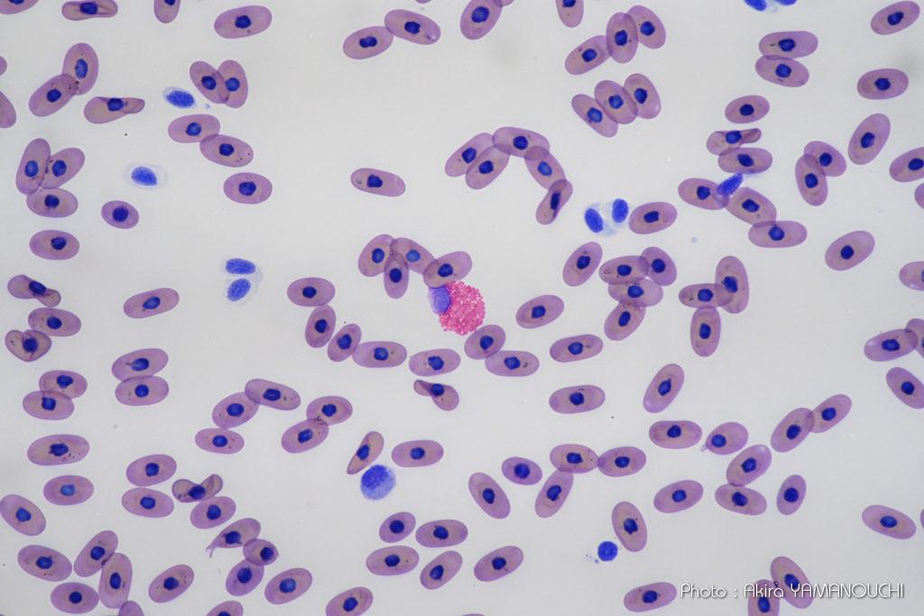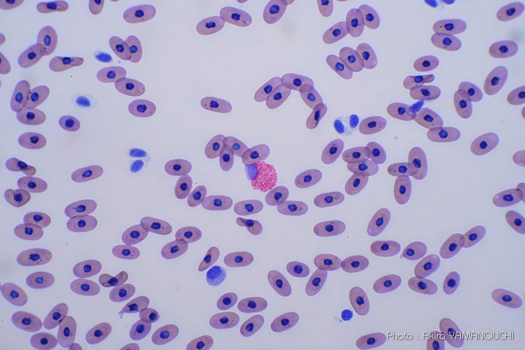 実写の解像度とコントラストを見たかったので、ミシシッピアカミミガメの血液塗抹標本を使用しました。好酸性の顆粒を持つ白血球が多数観察されたので、同一ターゲットを使用しました。