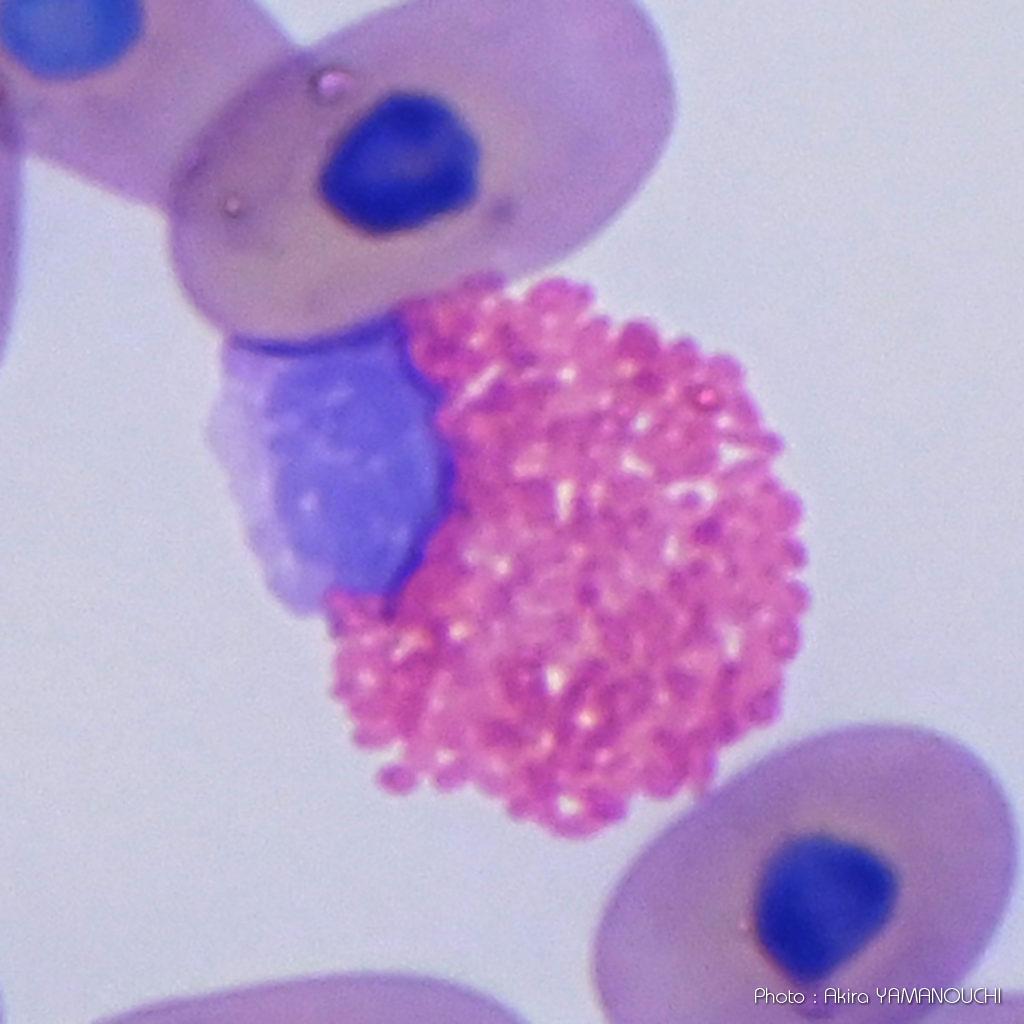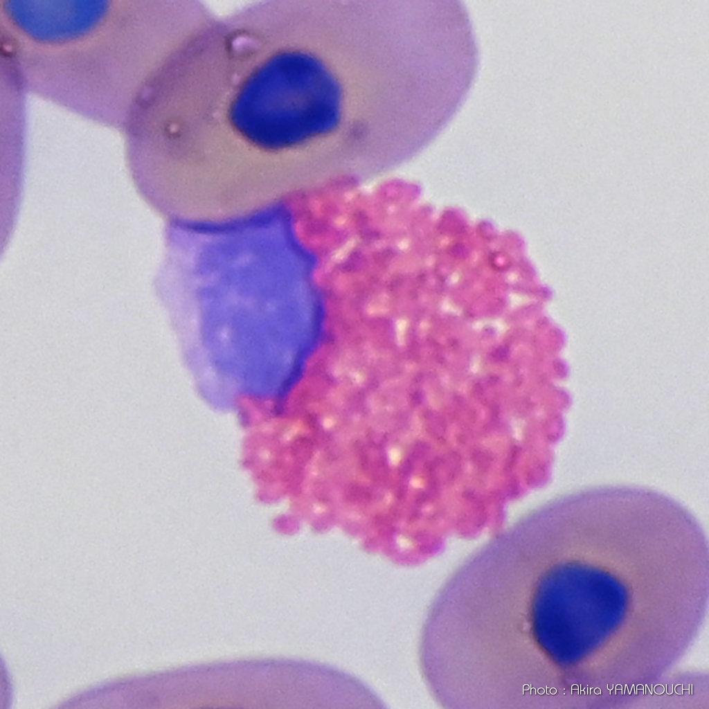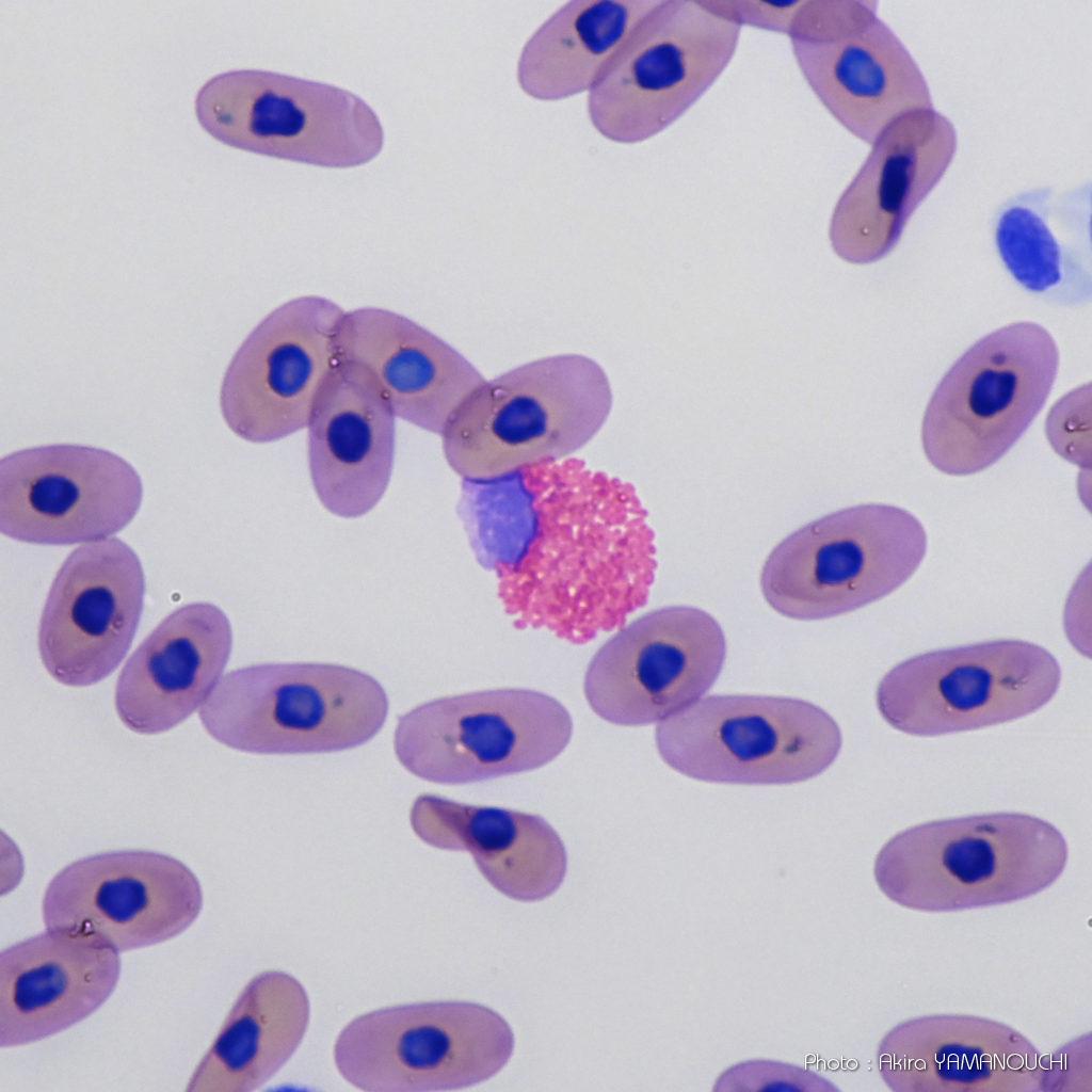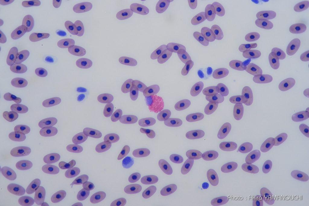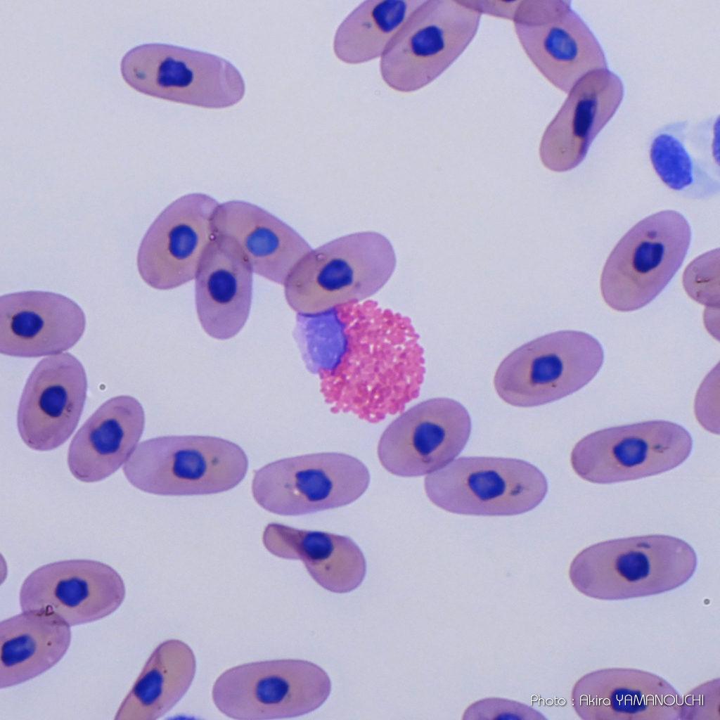 実写の解像度とコントラストを見たかったので、ミシシッピアカミミガメの血液塗抹標本を使用しました。好酸性の顆粒を持つ白血球が多数観察されたので、同一ターゲットを使用しました。